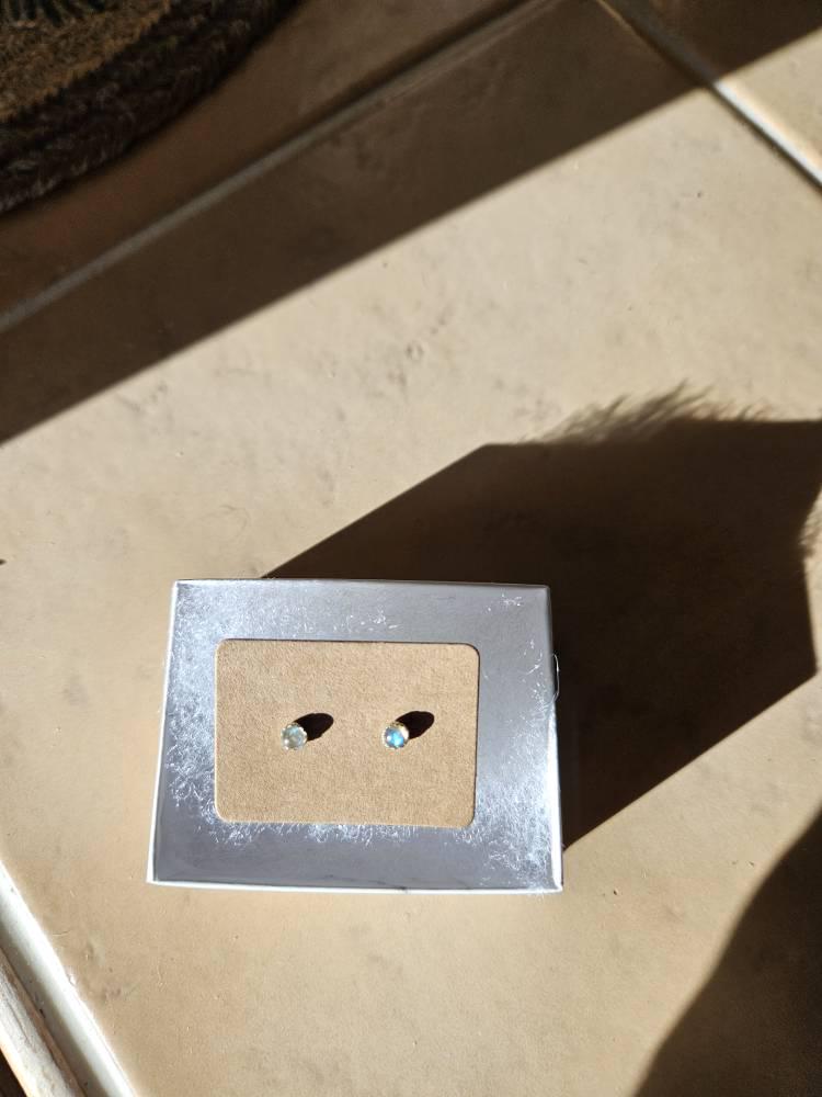 These Labradorite studs are truly lovely. The Labradorite gemstone in these earrings is a dark grayish with gorgeous gleaming purple and blue flashes of light. They are high quality, extraordinary stones. You can't see the tiny flecks in them as much as the phto shows since it is a close up.
