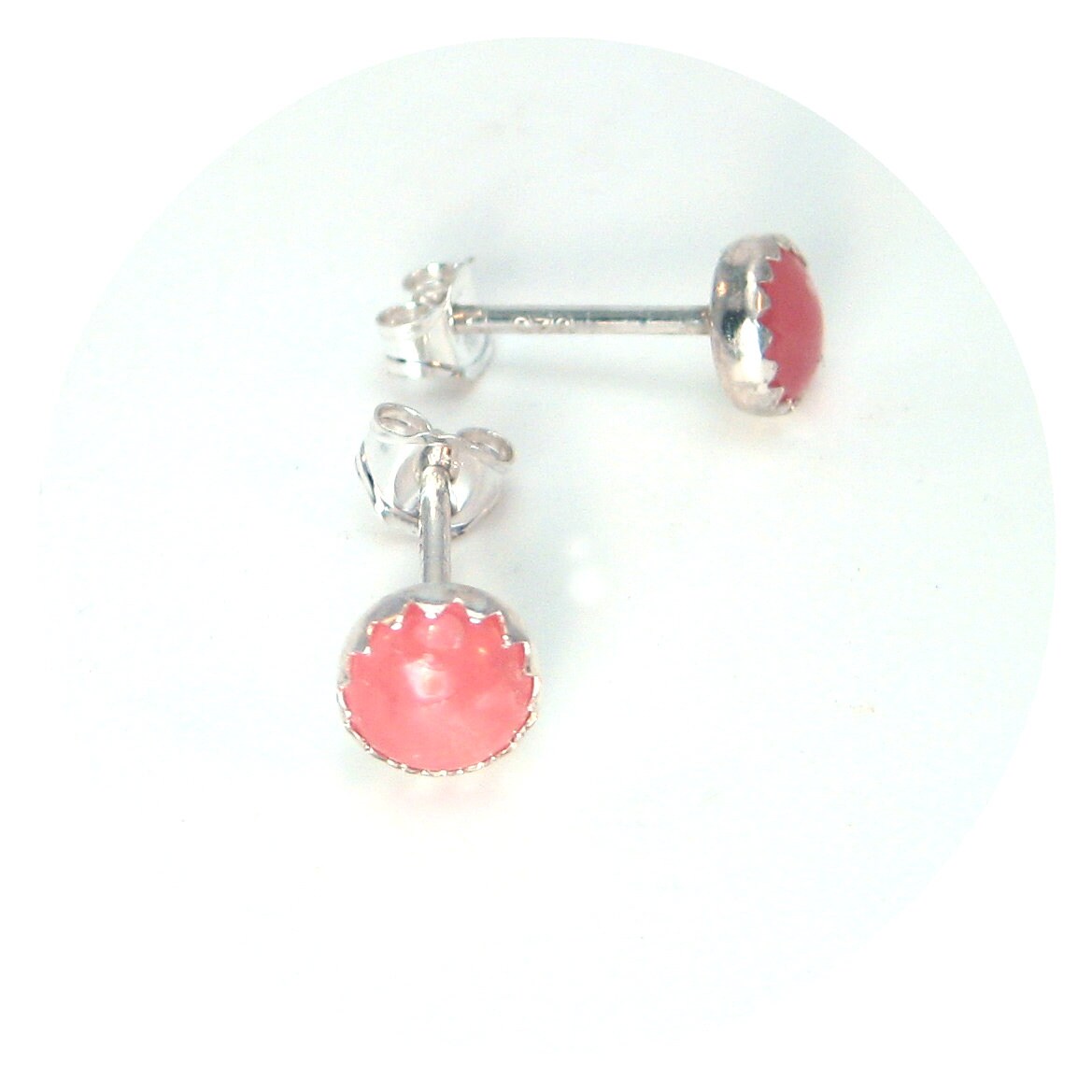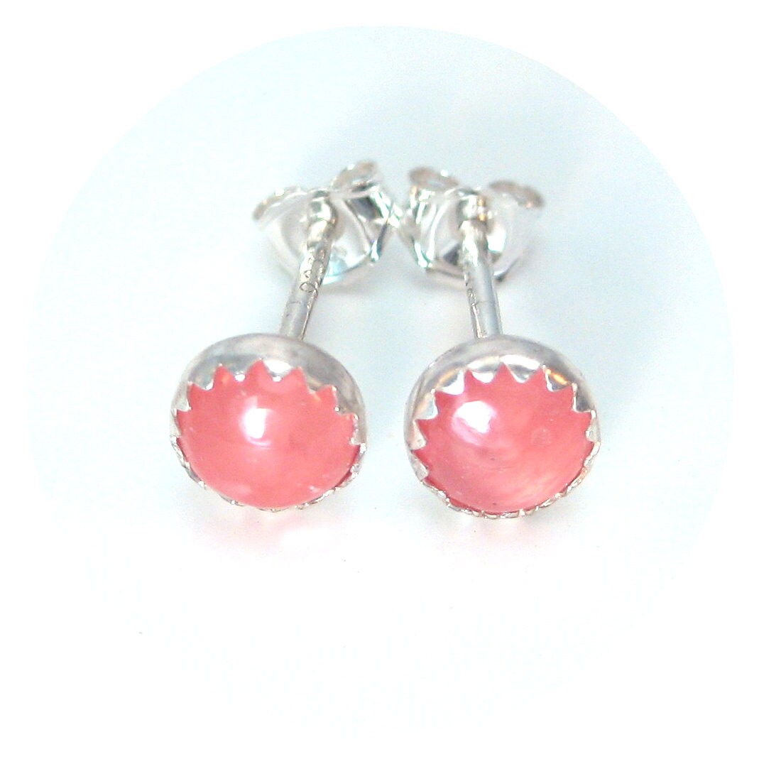 These genuine Rhodocrosite gemstone stud earrings are gorgeous. The stone is so incredibly beautiful. They are semi-translucent and a pretty peach-pink blush color. They have a Sterling Silver bezel, post and earring back. The stone itself measures 5 mm in diameter.
