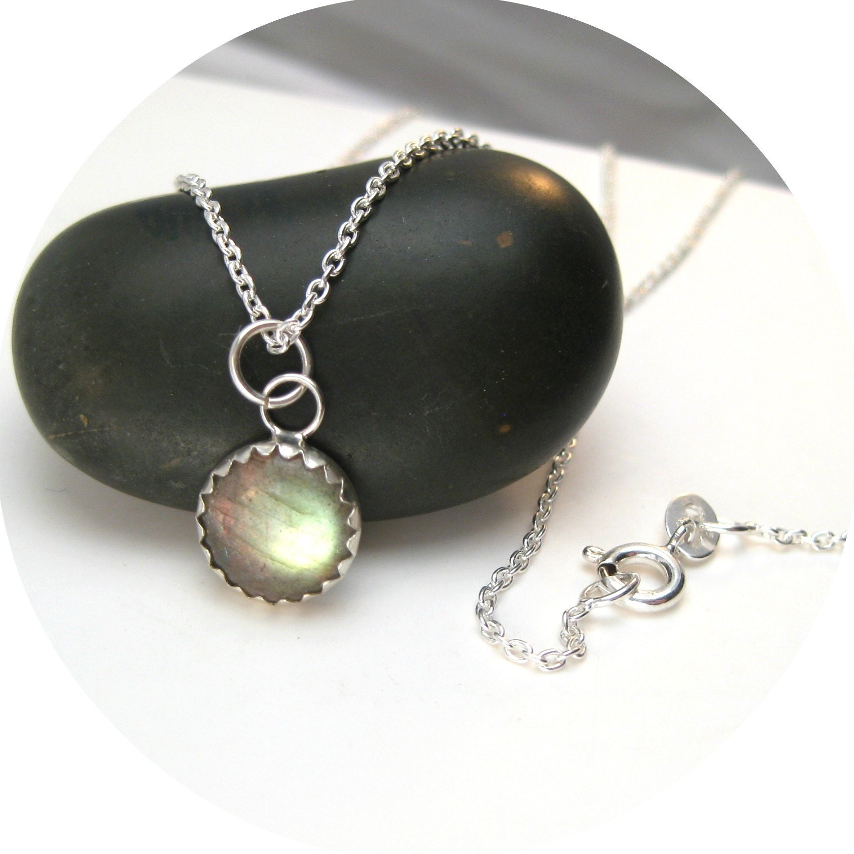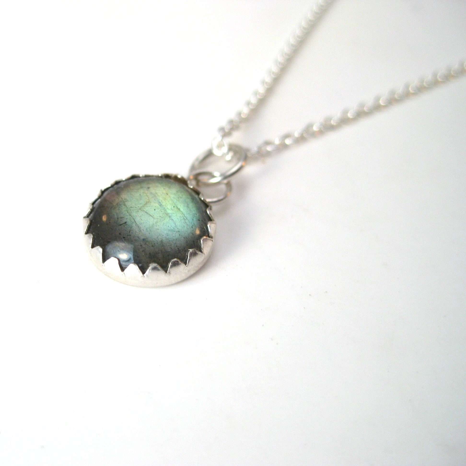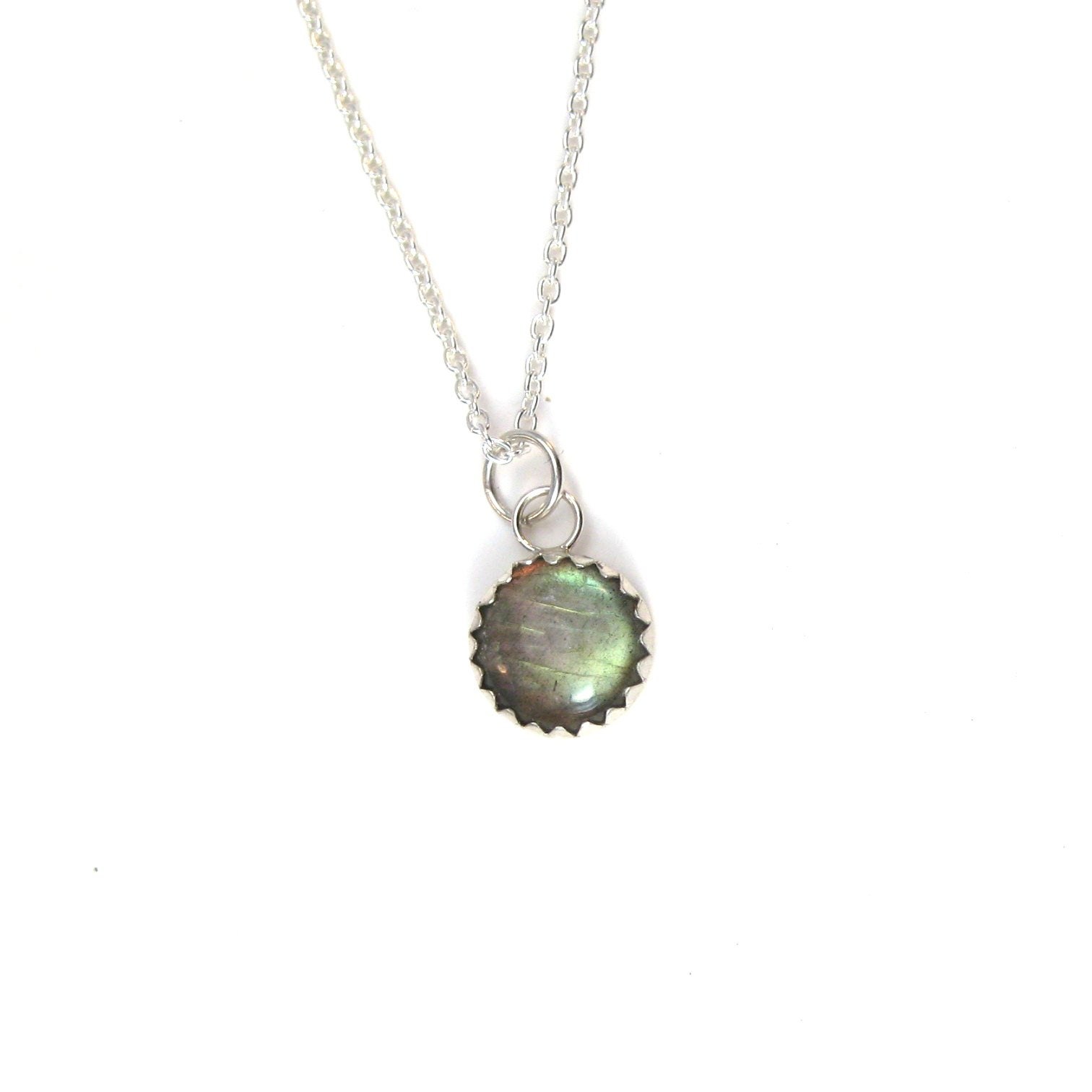 This necklace features a genuine Labradorite gemstone set in Sterling Silver bezel measuring 10 mm in diameter. The stone is absolutely stunning and has brilliant flashes of gray and green as well as hints of other colors on occasion. Pendant hangs from a solid Sterling Silver chain measuring 18"in length. Simple, high quality and perfect for everyday.